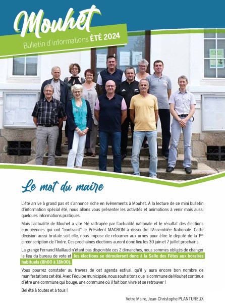 Chaque année nous réalisons un bulletin résumant les faits marquants à Mouhet. Nous réalisons également des lettres d’informations en cours d’année.